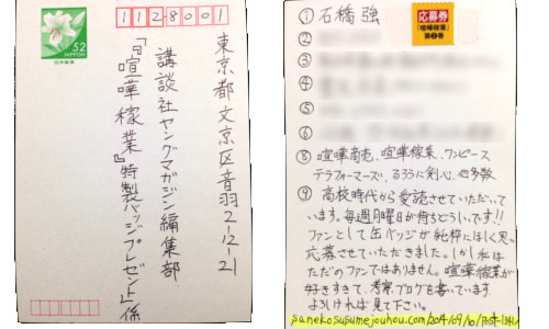 字が汚いうえに貧相な応募ハガキになってしまった・・・・ どうしたもんか・・・・何か恥ずかしいです。 欲しいバッジは石橋強にしました。 出来れば全種類欲しいんですけどね! とりあえず、自分のブログのURLだけは記入していき…